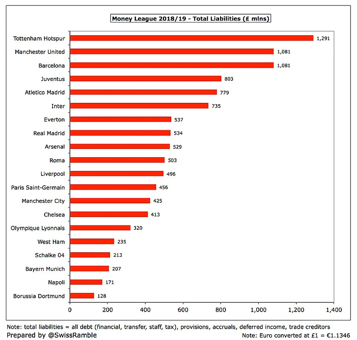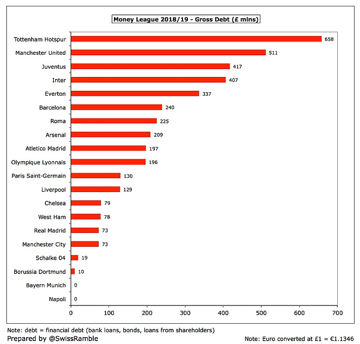 Самый большой финансовый долг у двух английских клубов: «Тоттенхэм» имеет долги на 658 млн фунтов (новый стадион) и «МЮ» на 511 млн (выкуп заемных средств Глейзеров). За ними следуют два итальянских клуба — «Ювентус» (417) и «Интер» (407).