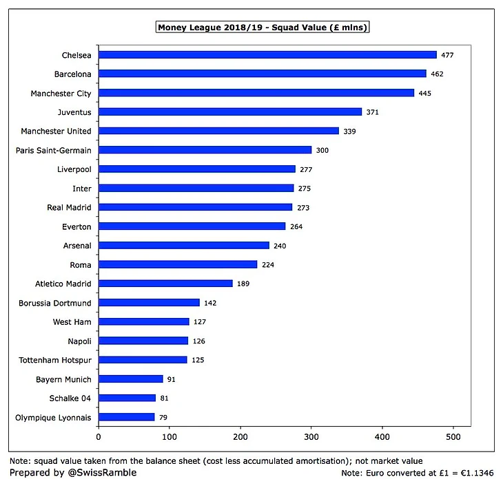 Клубы с наибольшей стоимостью состава, то есть со стоимостью за вычетом накопленной амортизации. Первое место у «Челси» — 477 млн фунтов, далее «Барселона» (466) и «Манчестер сити» (445). «Ювентус» на четвертом месте со стоимостью состава в 371 млн фунтов. Обратите внимание, что это не то же самое, что рыночная стоимость, которая будет намного выше. К примеру, по данной методике доморощенные игроки не имеют ценности.