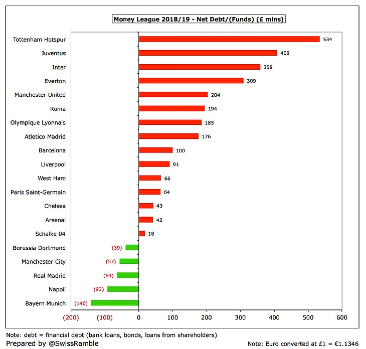 Самый высокий чистый долг (валовой долг за вычетом денежных средств) был самым высоким у «Тоттенхэма» — 534 млн фунтов. Далее идут «Ювентус» (408), «Интер» (358) и «Эвертон» (309). У пяти клубов были чистые средства — денежные средства, превышающие финансовый долг). Это «Бавария» (140), «Наполи» (93), «Реал Мадрид» (64), Манчестер Сити» (57) и «Боруссия Дортмунд» (39).