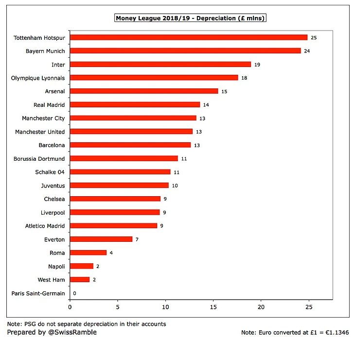 Наибольшая амортизация «Тоттенхэма» составляет 25 млн фунтов — из-за инвестиций в новый стадион. Далее идут «Бавария» (24), «Интер» (19), «Лион» (18) и «Арсенал» (15). Амортизация «Ювентуса» — 10 млн фунтов. В графике отсутствует ПСЖ, так как данной информации нет в их отчетах.