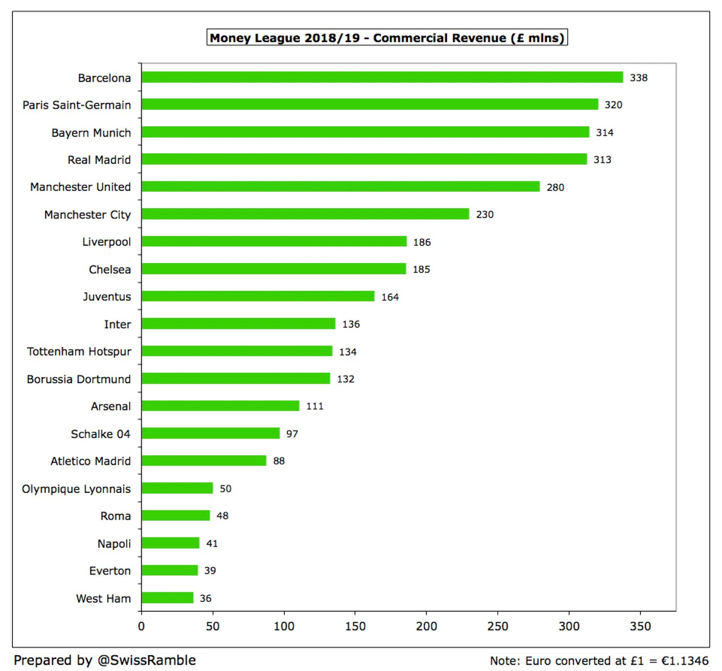 В коммерческом плане наблюдался значительный рост у «Барселоны» — на 52 млн фунтов до 338 млн, а также у ПСЖ — на 43 млн фунтов до 320 млн, но все осталось на прежнем уровне у «Баварии» (314), «Реал Мадрид» (313), «МЮ» (280) и «Манчестер Сити» (230). У «Ювентуса» девятое место с коммерческим доходом в 164 млн фунтов.