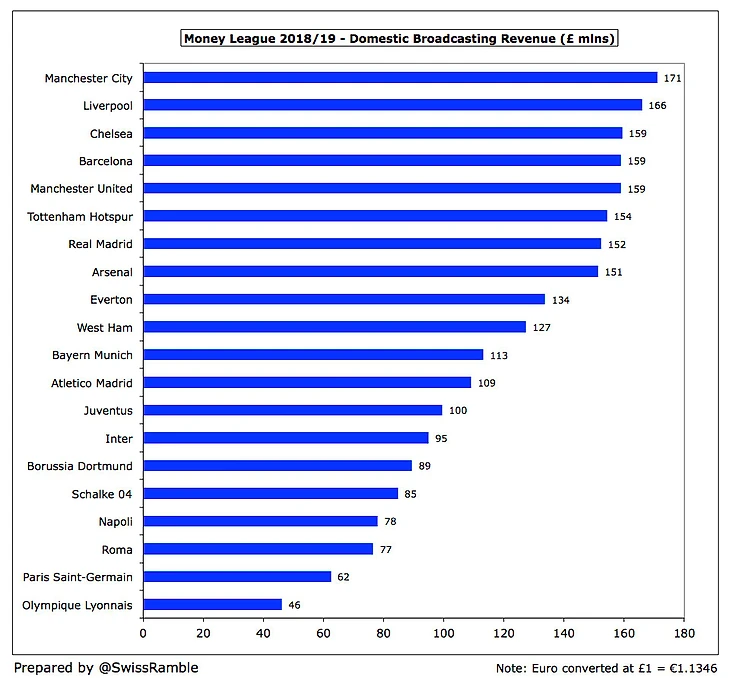 Благодаря выгодной внутренней сделке по телеправам, клубы английской Премьер-лиги заняли восемь из десяти первых мест по доходам от внутреннего телевидения. Возглавил список «Манчестер Сити» (171), чуть ниже «Ливерпуль» (166) и «Челси» (159). Исключением стали «Барселона» (4 место) и «Реал Мадрид» (7 место). Не лучшая сделка с французским телевидением отбросила клубы Лиги 1 «ПСЖ» и «Лион» на дно рейтинга. «Ювентус» на тринадцатом месте с доходом от домашних телеправ в 100 млн фунтов.