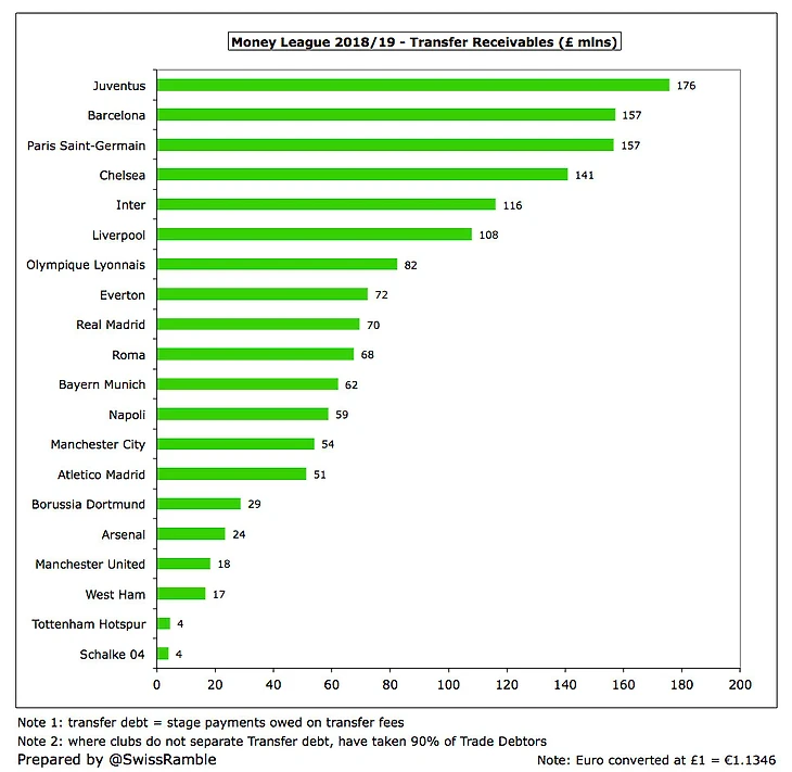 Все клубы платят за трансферы поэтапно, потому трансферный долг является важным обязательством помимо финансового долга. Наибольшая кредиторская задолженность по трансферам составила у «Барселоны» 230 млн фунтов, у «Ювентуса» — 195 млн фунтов, у «МЮ» — 188 млн, у «Ливерпуля» — 167 млн.