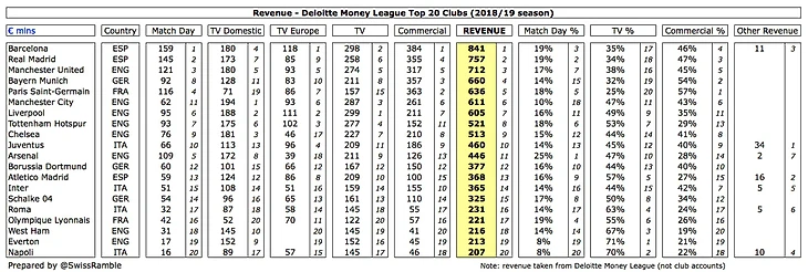 Обзор доходов включает в себя подробную информацию о потоке доходов — день матча, трансляция и реклама, с дальнейшим разделением трансляций между внутренними соревнованиями и турнирами УЕФА. Прочая выручка — это в основном аренды игроков, которые не всегда включаются в выручку от Deloitte.