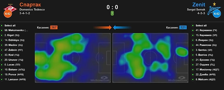 Но у «Зенита» была очевидная проблема с отсутствием креатива в центре поля. Все видно на тепловой карте по итогам первого тайма (второй не берем, «Спартак» открыл центр поля после пропущенного гола, и «Зенит» развивал там контратаки, а не позиционные наступления): «Спартак» много разыгрывает мяч в зоне Крал — Зобнин — Маслов и строит атаки через левый фланг, в то время как «Зенит» вообще практически не держит мяч в центре поля.