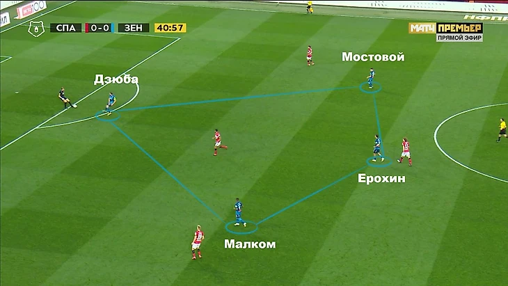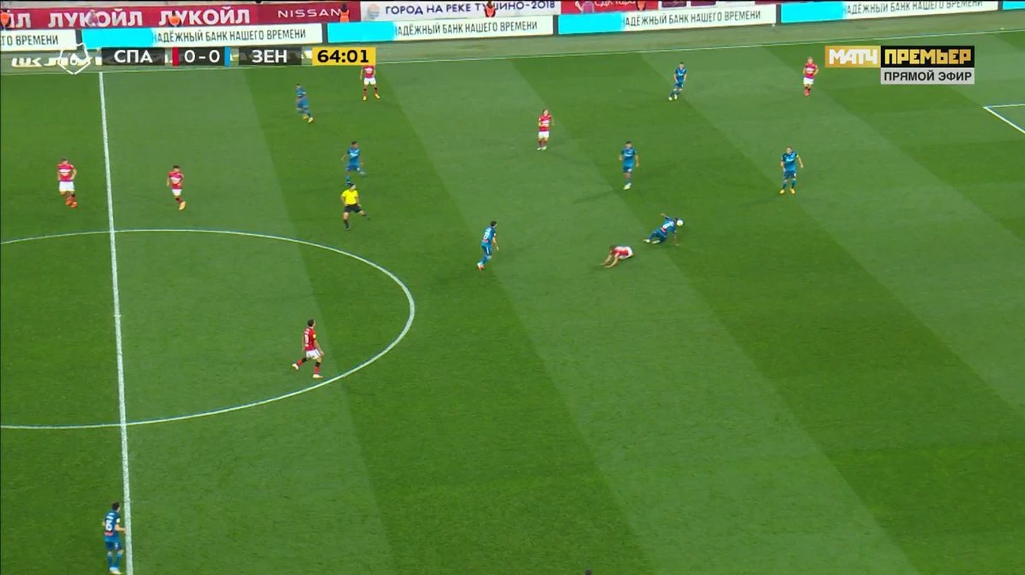 Но Маслов при помощи опускавшихся Крала с Зобниным справлялся. «Зенит» же при прессинге образовывал атакующий ромб Малком — Дзюба — Мостовой — Ерохин, который нейтрализовывал начальную стадию развития атак «Спартака», заставляя выносить на Понсе и Ларссона. Аргентинца и шведа без проблем поджимали Ловрен с Ракицким и заставляли пасовать назад.