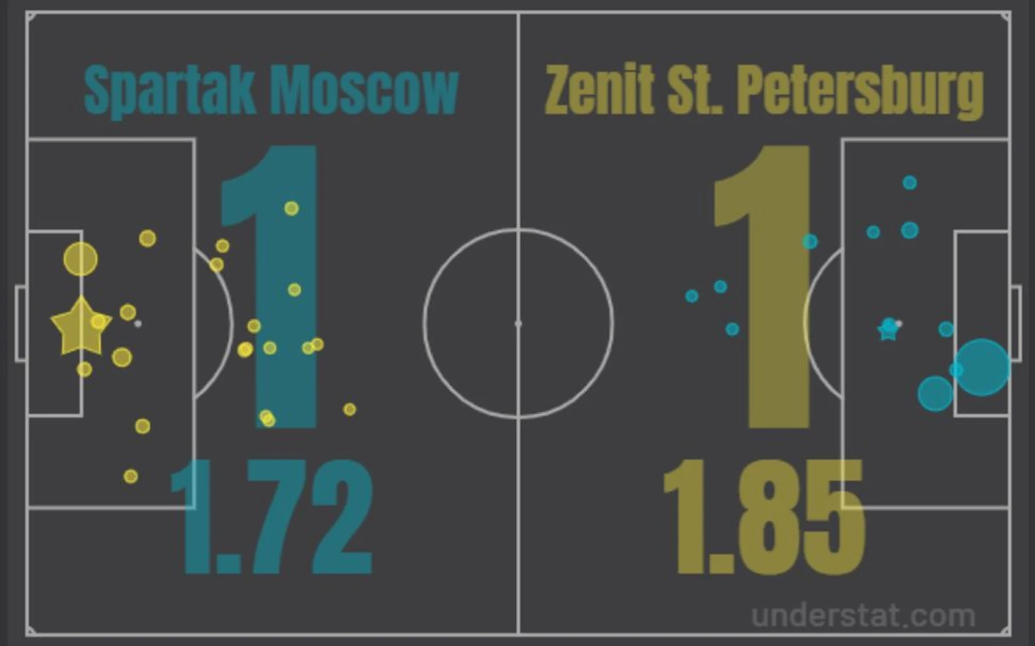 По точкам ударов видно, что выстрелы «Зенита» из-за штрафной имеют малый вес — логично, что и вероятность забить гол отсюда ниже, чем при ударе из штрафной. В итоге при разнице ударов 13-22 «Зенит» совсем немного превзошел «Спартак» по xG при том, что доминировал на протяжении почти всего матча.