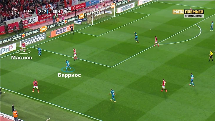 Вообще, «Зенит» сделал серьезную ставку на прессинг. Особенно поджимали зону Маслова, через которого «Спартак» почему-то чаще всего выводил мяч — в первом тайме у Павла было больше всех передач за тайм среди игроков обеих команд после Алекса Крала. Эту зону «Зенит» и пытался поддавливать. Включался даже Барриос.