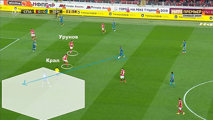 Алекс, к слову, провел блистательный матч, став лидером «Спартака» по числу ключевых передач и роскошно развернув трех игроков при голе Понсе. Крал прекрасно ведет игру в центре поля, он ключевой футболист в плане построения позиционных атак. Но рядом с ним не хватает партнера, который будет четко страховать свободные зоны. Остон Урунов в игре с «Зенитом» показал, как НЕ должен играть партнер Крала по центру полузащиты. Узбекский футболист по привычке много лез в обводку, иногда его дриблинг помогал «Спартаку» выходить из-под прессинга, но чаще Урунов задерживал атаки и передерживал мяч. В этом моменте Малком обокрал его в опаснейшей зоне.
