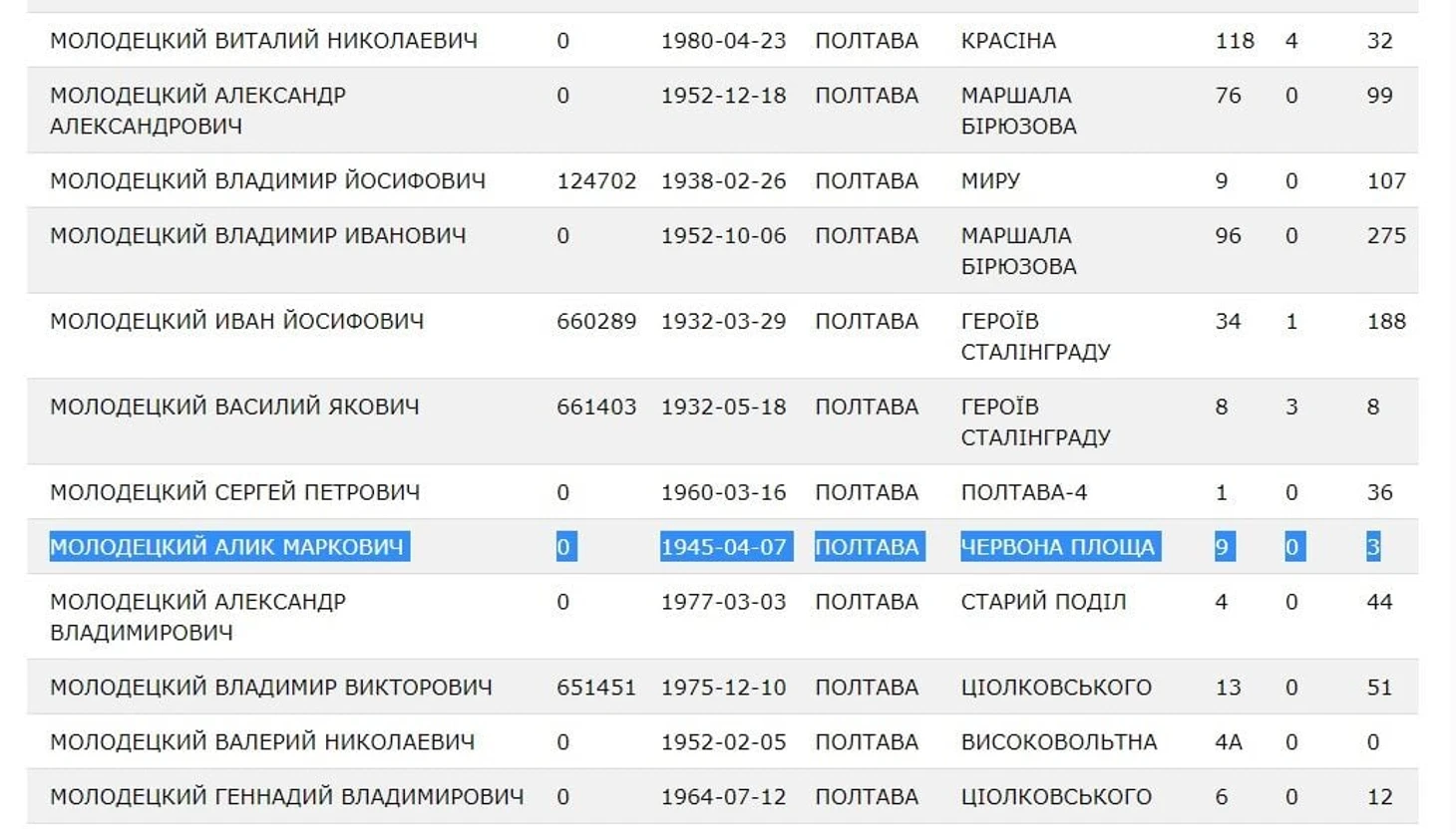 Ну и финальное: сначала мы не могли найти Молодецкого Александра Марковича (полное имя есть в статье «Сегодня») в базе жителей Украины, но затем поняли, что его настоящее имя не Александр, а Алик. Кроме имени все совпадает: