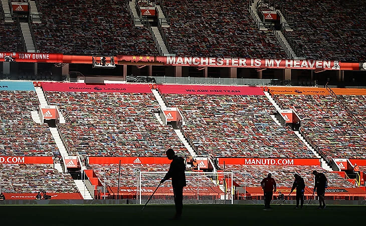 Трибуны «Олд Траффорд» же оказались заполнены сразу двумя способами. Во-первых, клуб перемешал спонсорские баннеры с фотографиями болельщиков. Официальное приложение «МЮ» кидало пуш еще летом, когда возобновлялся прошлый сезон: можно было прислать свое фото и хотя бы виртуально оказаться на стадионе.