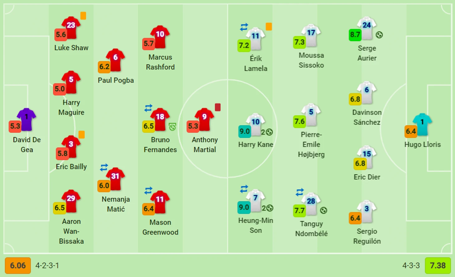 Юнайтед выбрал стандартную расстановку 4-2-3-1, а Тоттенхэм 4-3-3, но не обычные 4-3-3. Полузащитники Тоттенхэма более оборонительные, чем атакующие, единственный, кто способен создавать хоть какую-нибудь ширину - это Сиссоко. У Юнайтед был план сыграть через Фернандеша, как всегда, но красная карточка все испортила, МЮ не был готов к этому. Бруно пришлось играть центрального форварда в некоторых эпизодах, и в целом пришлось перестраивать всю игру, что было невозможно во время матча, а только в перерыве, и то очень сложно, Сульшеру это не удалось.