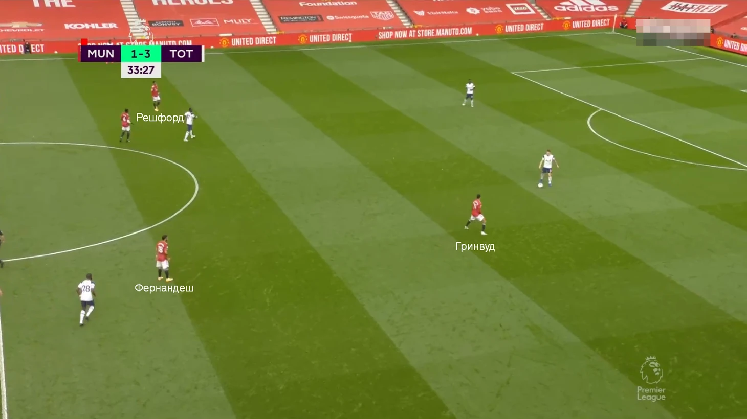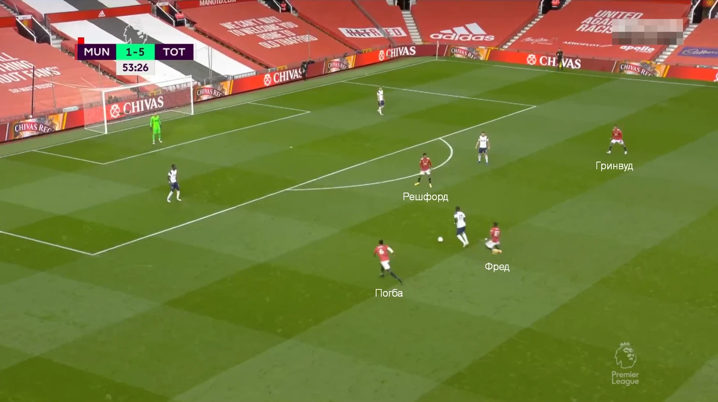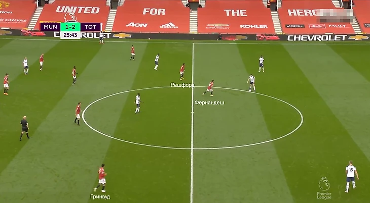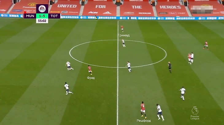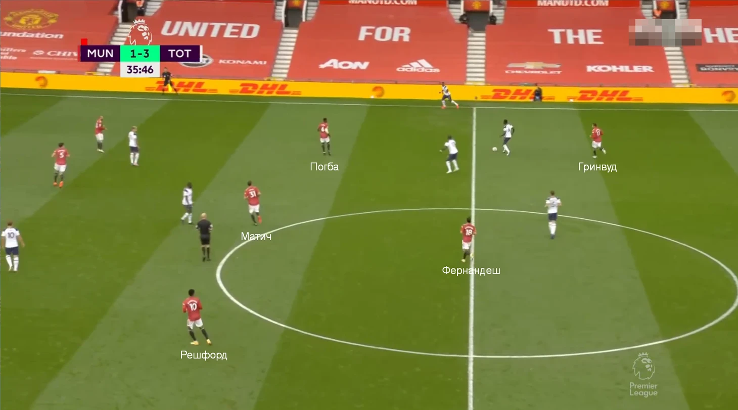 Когда Фернандеша выдергивали с позиции, и ему приходилось подниматься выше и прессинговать, тогда Решфорд и Погба садились назад в линию полузащиты к Матичу. Но тем не менее, если посмотреть на скриншот, то можно увидеть, что у Тоттенхэма очень много свободных игроков между полузащитой и защитой Юнайтед, это большая ошибка игроков Манчестера.