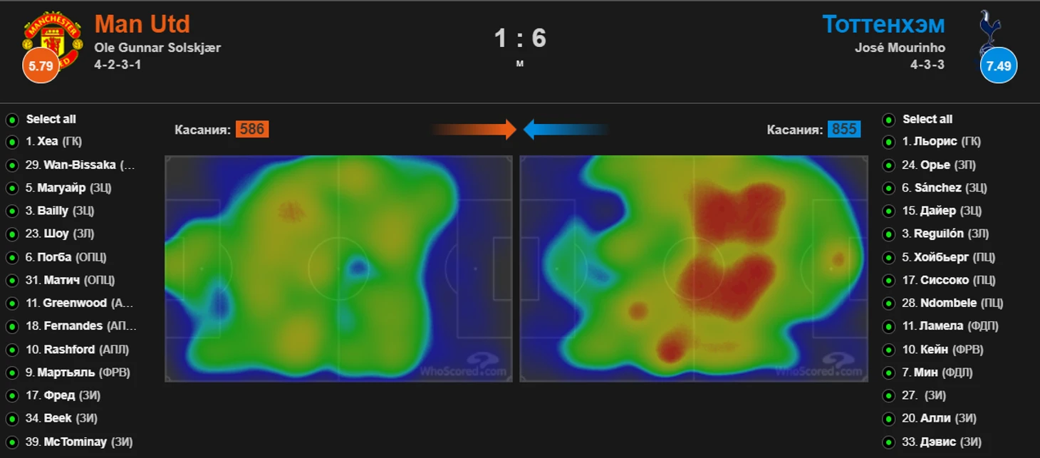 Карта Тоттенхэма очень мощная, особенно в центре поля. А такой красной в центре поля она стала во время того, как Шпоры катали мяч и не хотели отдавать его хозяевам, так-же на выигрыш центра поля Тоттенхэмом сильно повлияла замена Фернандеша, никто кроме как Бруно не мог владеть мячом и находить партнеров, но Сульшер почему-то решил его быстро заменить, опять же - надеюсь, что это не просто тактическое решение, ибо оно очень тупое.