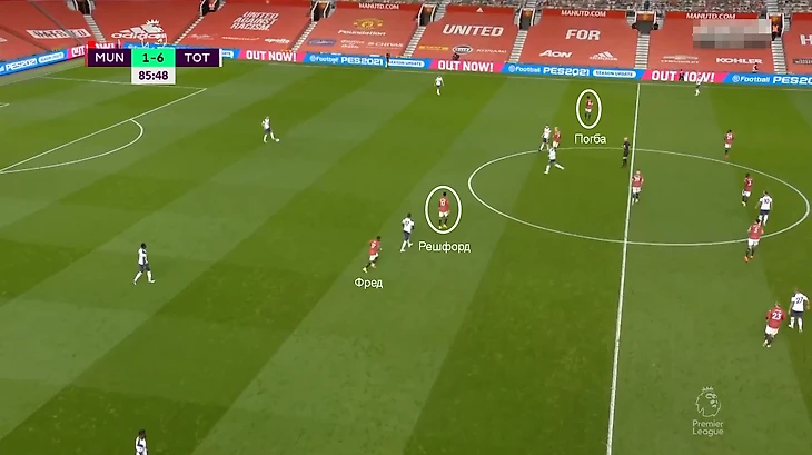 На 86-й минуте, когда играть уже было бессмысленно (в плане добытия победы) Манчестер Юнайтед просто смирился с поражением. На скрине видно, что Решфорд просто ходит по полю, никто не прессингует игроков Тоттенхэма, а Погба кочует с одного фланга на другой.