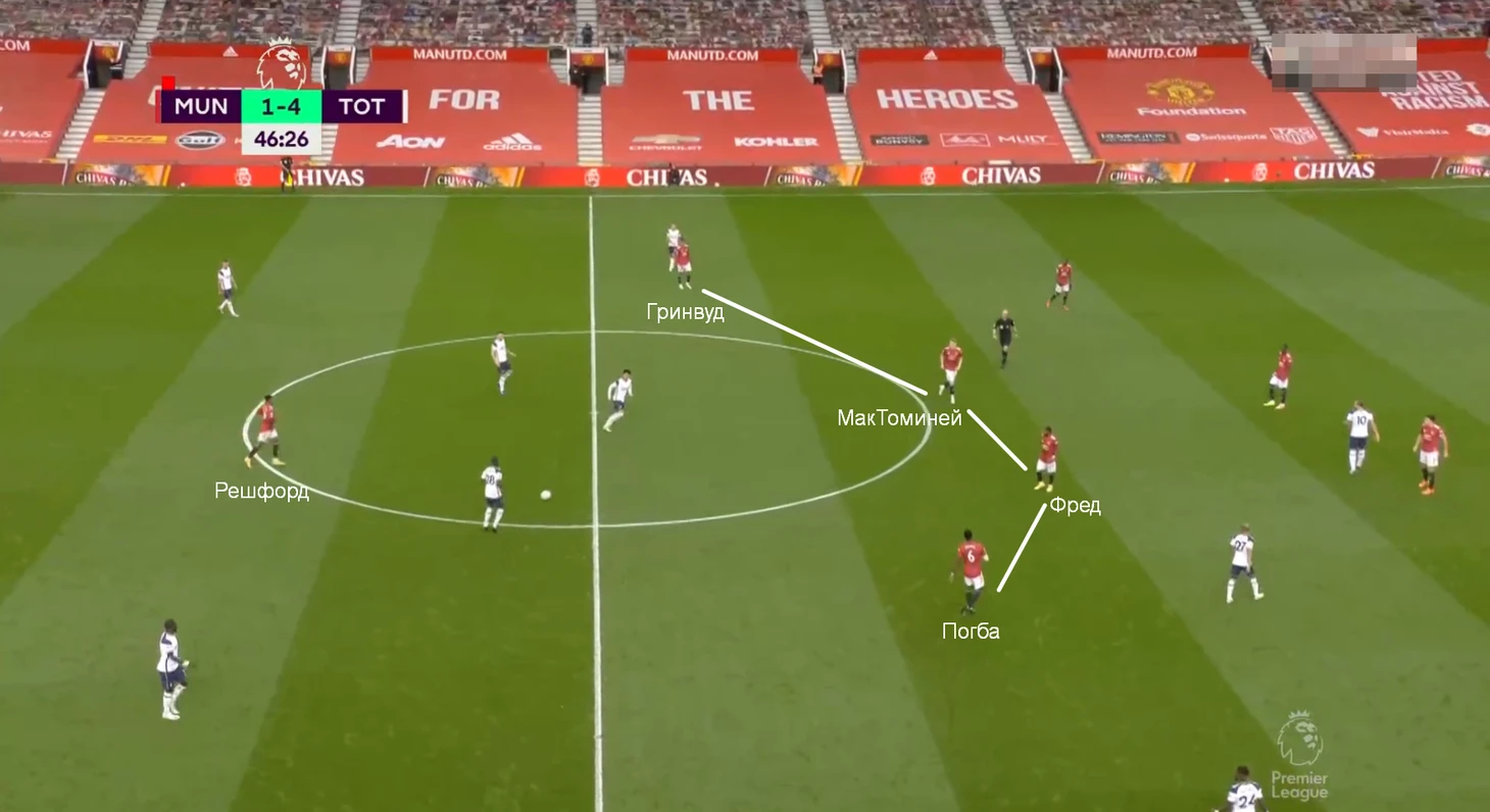 МакТоминей и Фред сели в опорную зону полузащиты, Погба с Гринвудом играли на флангах, а Решфорд играл на позиции форварда, но так как игроков не хватает, и каждый должен отрабатывать до конца, Решфорд должен играть назад, но он этого не делал.