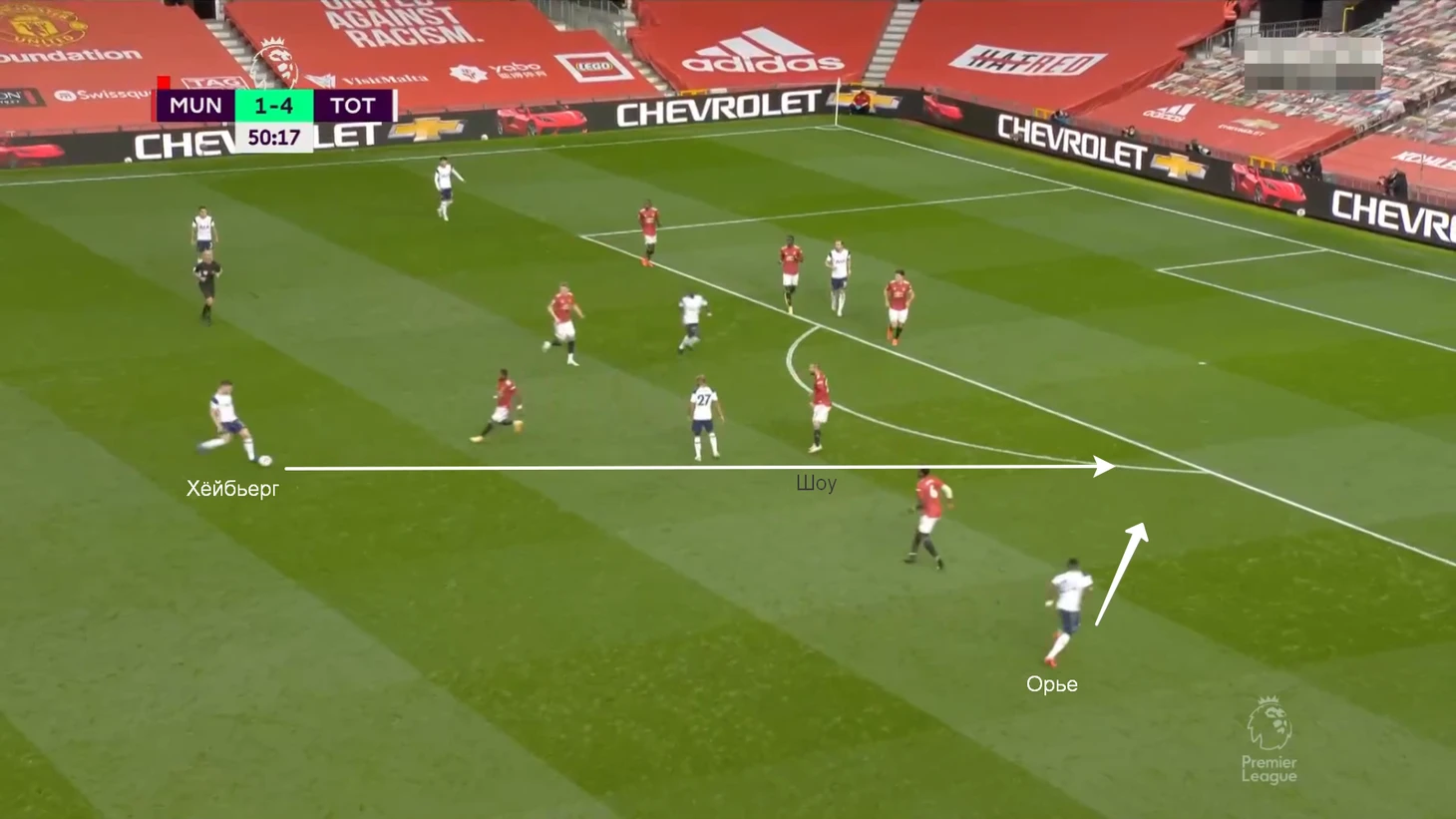 Во время пятого мяча Тоттенхэма опять провалился Шоу. Люк оставил свой фланг пустым, никто его не подстраховал и туда вбежал Орье. Никому неизвестно почему Люк Шоу поднимается в эту зону, это же очень глупо, он оставляет за спиной огромную зону. Стоит так-же отметить гениальную передачу Хёйбьерга и его виденье поля.