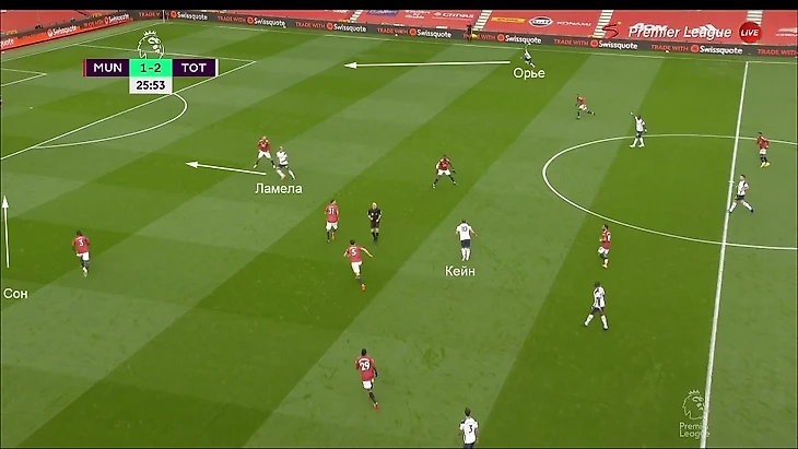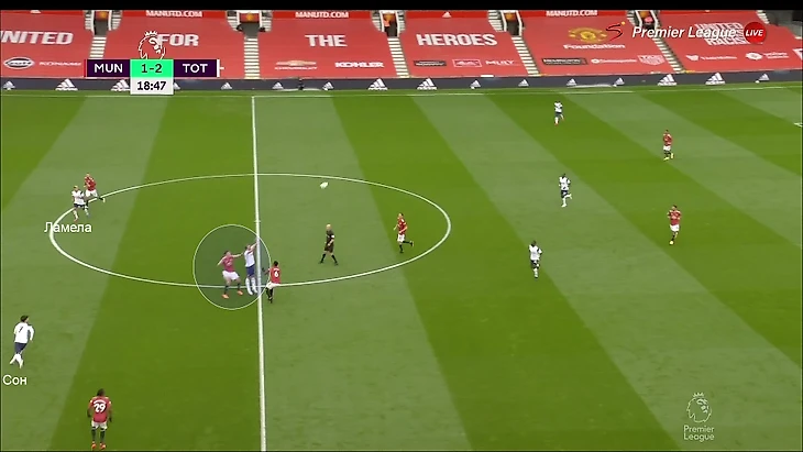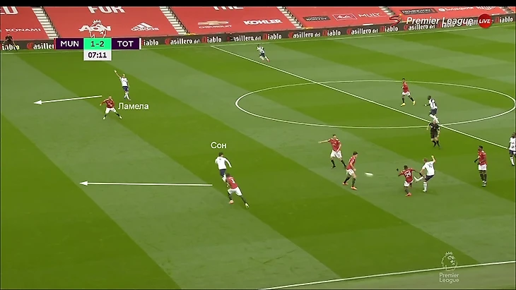 Взаимодействия в этом эпизоде могли быть разными – скидка от Харри головой, разворот и пас вразрез, выигранный подбор и обостряющая передача. Сохранялась суть – Харри выманивает центрального защитника (как правило, Магуайра), а Сон и Ламела открываются против разбитой линии защиты «МЮ».