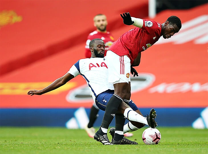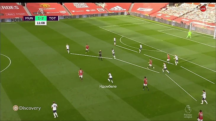 14. Еще одна причина, почему прессинг «Юнайтед» совсем не получался – Танги Ндомбеле. Игра под давлением и продвижение мяча на индивидуальных качествах – его сильная сторона. При обороне он играл рядом с Кейном, но в позиционных атаках опускался и помогал в развитии атак. Очень качественно справился.