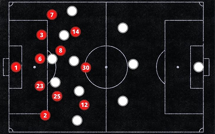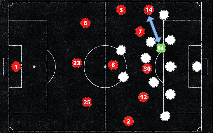 Артета придумал очень необычный вариант построения атаки, позволяющий Обамеянгу действовать из глубины, но здесь имеются свои минусы. Скопление игроков на левом фланге атаки снижает эффективность их действий, заставляет их дублировать позиции друг друга.