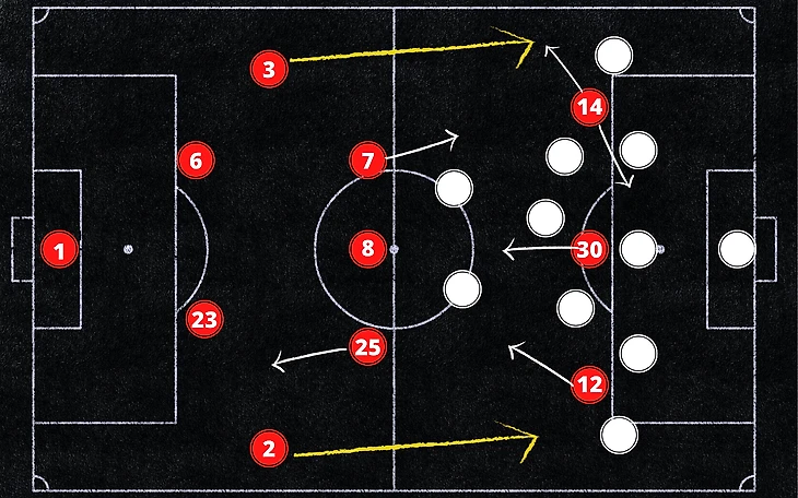 В матче с Шеффилдом Арсенал очень уверенно владел мячом, организуя позиционные атаки с помощью коротких передач. Артета использовал двух опорных полузащитников и перестраивал команду на схему 3-1-4-2 во время владения.