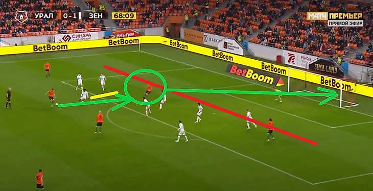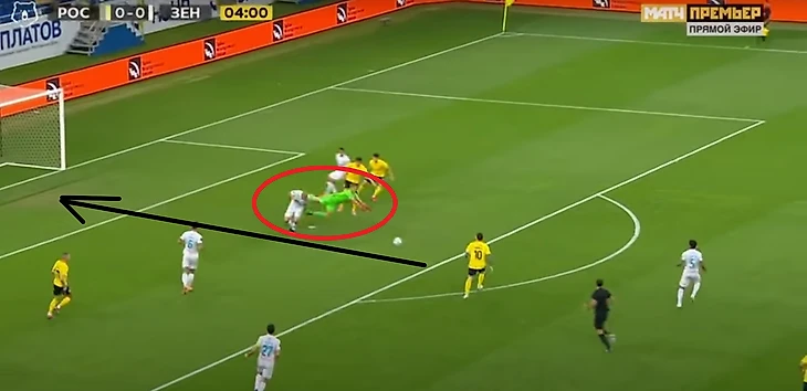 Любого человека можно заставить ошибаться, тем более когда есть оценка твоей работы через результат. Нагружать опасные зоны в штрафной площади через хорошие подачи и забросы. Пример на фото из матча 2 тура РПЛ в игре с Ростовом. Подача приводит к ошибке на выходе. Отскок мяча на игрока соперника в убойную зону.