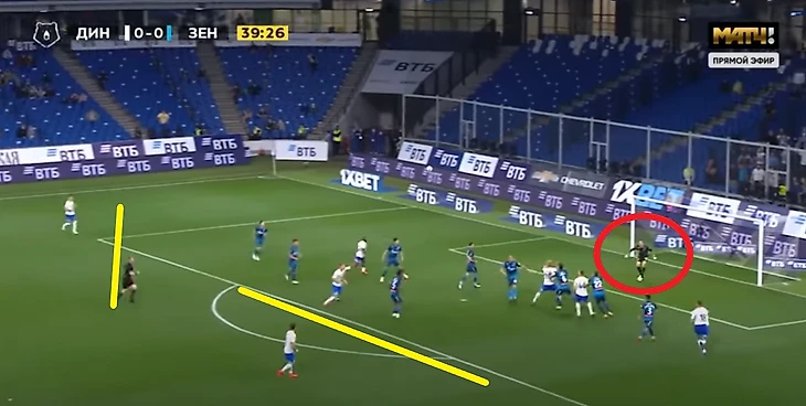 2. Перед штрафной площадью Зенит обороняется позиционно, при этом отдавая пространство сопернику под удар.