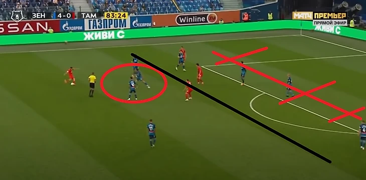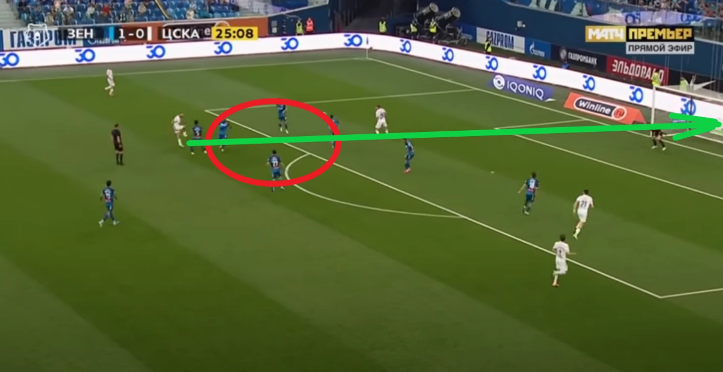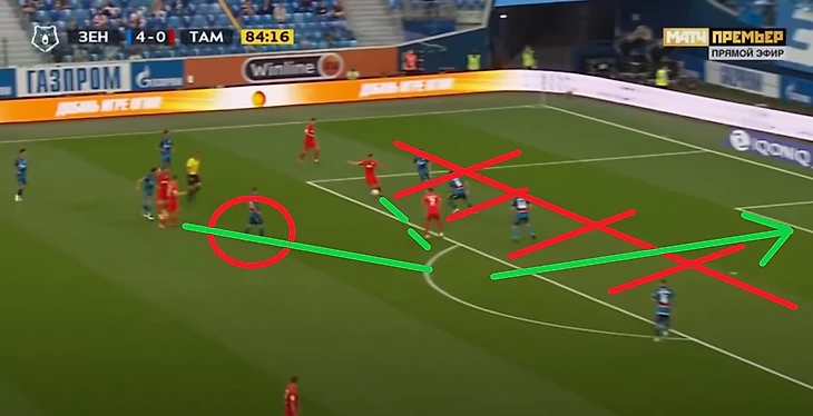 Барриос (5 номер) и Малком (8 номер) не успевают накрыть удар Влашича. Скорее это ошибка игрока из под которого бьют, но посмотрите, целых пять человек в отрезанной зоне (помечено красным кругом). Во-первых, должен был быть подсказ "накрывай/не дай обыграть" , но встречают игроки 3 языков ( португальского, русского и хорватского) , из этого делаем вывод, что чуть более быстрые игроки уровня Влашича, которые принимают решения моментально заставляют теряться игроков Зенита. Поэтому, Лига чемпионов расставит все на свои места, а игра с Сочи может подчеркнуть слабости команды из Петербурга при быстрых атаках южан. Конечно, не каждая команда в РПЛ имеет такого мастера как Никола (8), но почему бы не попробовать поставить техничного и быстрого футболиста, который может взять на себя инициативу, попробовать обыграть одного или протащить мяч и пробить по воротам ... Посмотрим, что из этого получится.