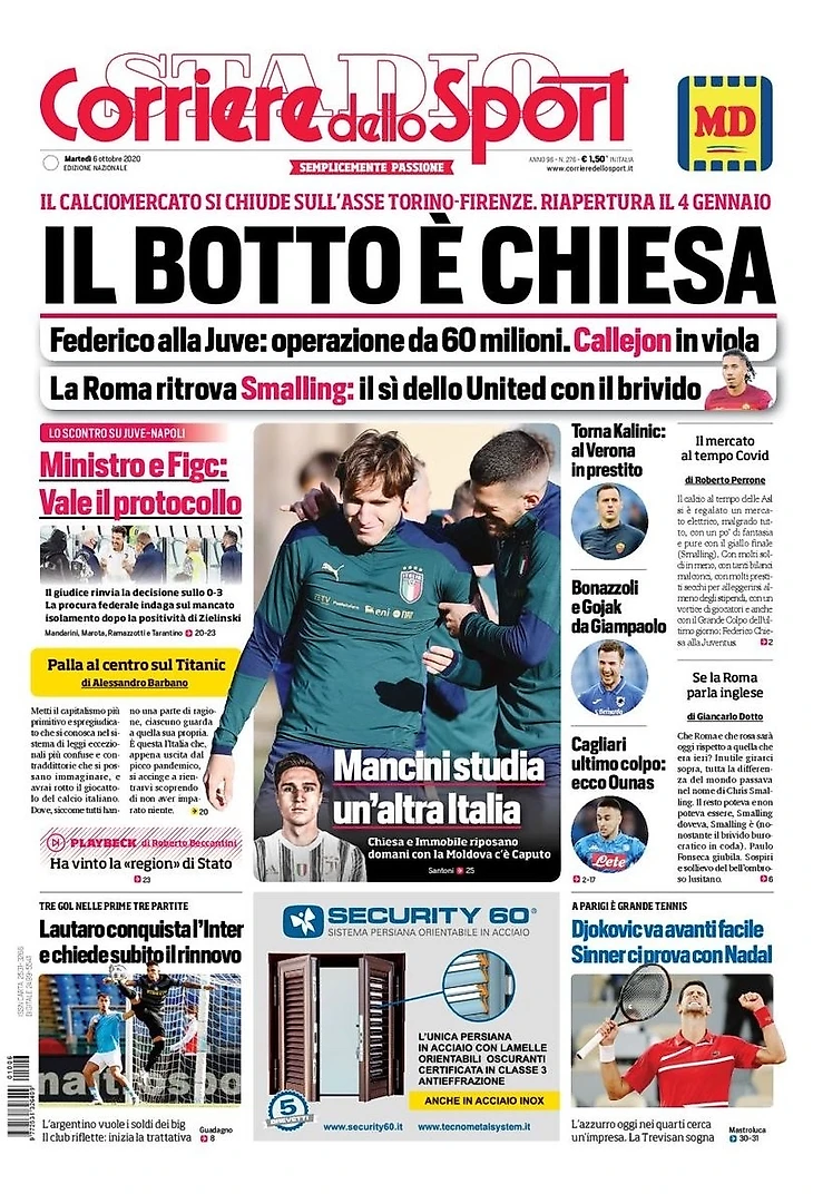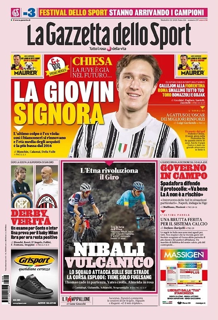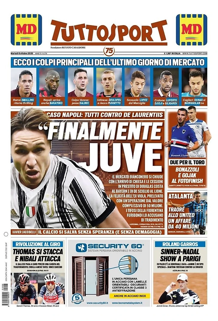 Проблема «Наполи»: все против Де Лаурентиса. Рынок Бьянконери закрыт с приходом Кьезы и продажей в аренду Дугласа Косты в «Баварию» и Де Шильо в «Лион». Радость бывшего игрока «фиалок», которого взяли в операции общей стоимостью 50 миллионов. Болельщики «Фиорентины» в ярости, они обвиняют его в измене.