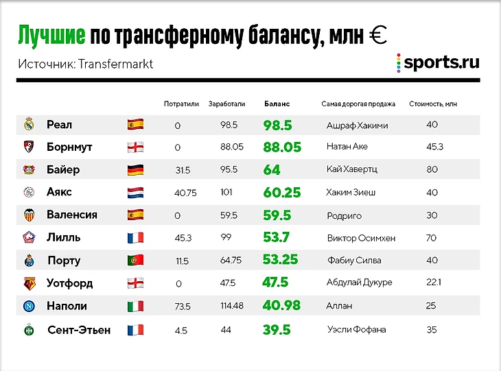 Дополнительно мадридцы заработали около 100 млн и неожиданно стали лучшими по трансферному балансу. Хакими ушел в «Интер» (40 млн плюс бонусы), Регилон в «Тоттенхэм» (30 млн +5), Хамес уже зажигает в «Эвертоне» (25 млн, хотя некоторые медиа утверждают, что переход был бесплатным), Оскара Родригеса отдали в «Севилью» (15 млн за 75% прав). «Мадрид» по максимуму расчистил состав и даже сэкономил 50 млн на зарплате Гарета Бэйла. Многие уверены, что Перес копит деньги на трансфер Мбаппе летом-2021.