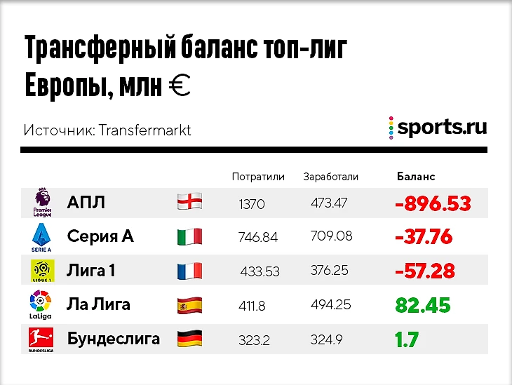 Вы еще удивлены, что Ла Лига осталась в плюсе? По крайней мере по деньгам от трансферов. Кроме нее положительный баланс у Бундеслиги и у португальской Лиги NOS (+75,89). РПЛ пока в минусе на 50 с небольшим миллионов, но ее окно закроется только 19 октября.