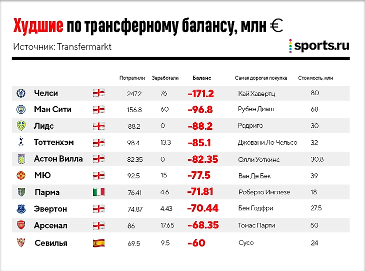 • У «Лидса» худший трансферный баланс после «Челси» и «Ман Сити» – уже вполне привычная картина для клубов, которые врываются в АПЛ из Чемпионшипа и закупаются в расчете на деньги от телетрансляций. Лидирующие сейчас в АПЛ «Эвертон» и «Астон Вилла» тоже залетели в топ-10 по худшему балансу.