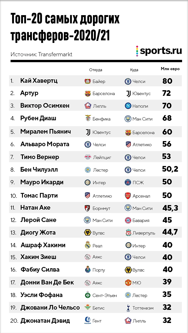 • «Челси» с отрывом главный по тратам в это окно. В топ-10 помимо Хавертца попали Вернер и Чилуэлл, в топ-15 – Зиеш. Лэмпард также подписал Менди за 24 млн и свободных агентов Силву и Сарра.