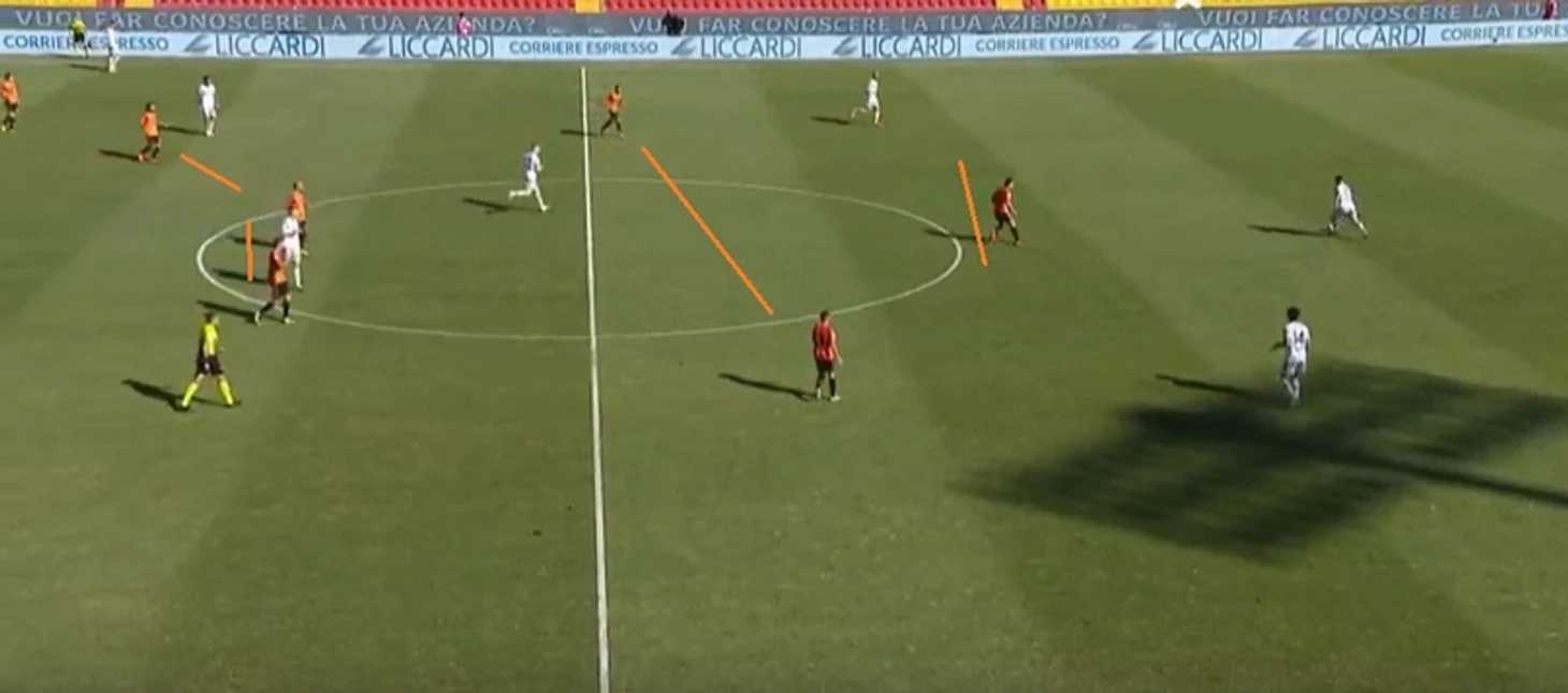 « Беневенто» хоть и пытался выходить в атаку через левый фланг, но им не хватало изобретательности, игроки хозяев очень часто теряли мяч под давлением гостей. В таких случаях хозяева сразу откатывались на свою половину поля ( проблемы с построением прессинга возникали и в Серии Б, поэтому Индзаги отказался от активного отбора уже тогда), терпеливо выжидая нового шанса для контратаки, действуя либо в 4-3-3 ( гибрид в 4-3-2-1), либо в 4-5-1 (по обстоятельствам):