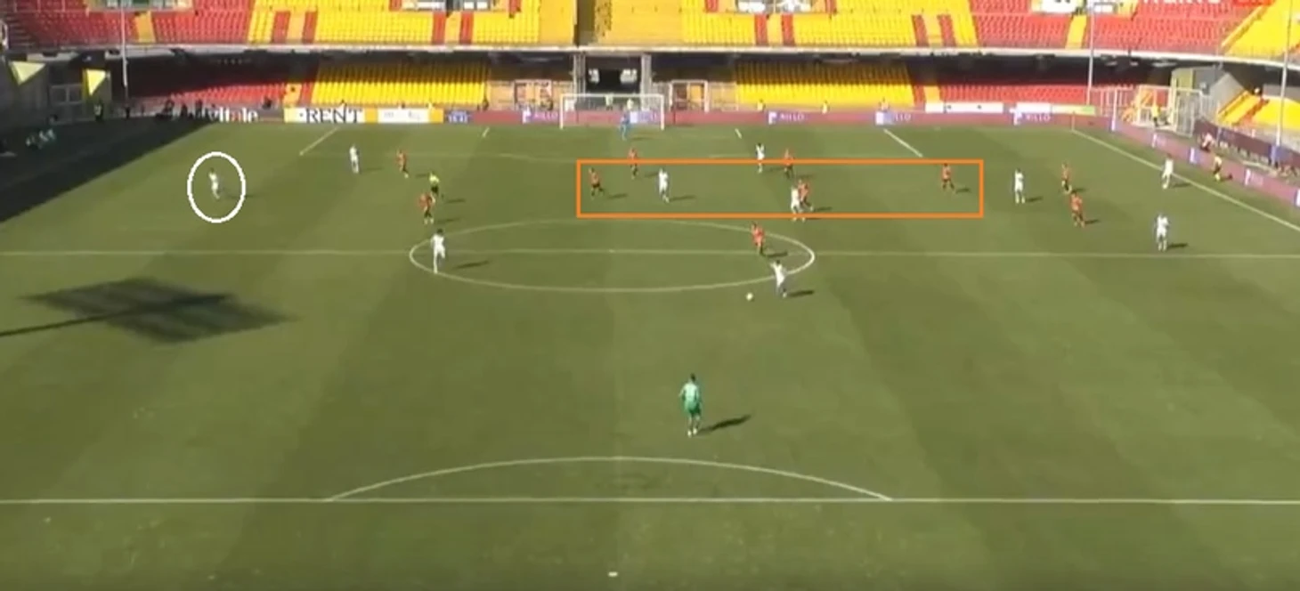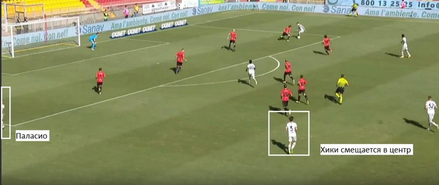 В случае с 4-3-2-1 Капрари и Фальке занимали не слишком узкую позицию, чем пользовался Медель ( первый пас + против двух ЦЗ только один нападающий) и опускающийся регулярно ниже Схауден . В таком случае сразу трое игроков « Беневенто» были бы обрезаны. Учитывая, что тройка опорных хозяев старалась действовать низко и перемещаться всем блоком, то гости пытались вскрыть оборону флангами ( 28 кроссов):