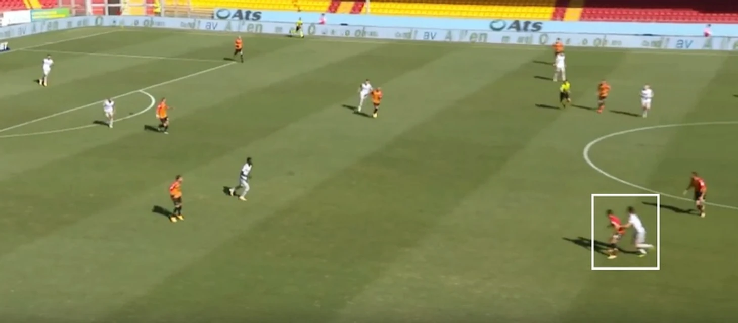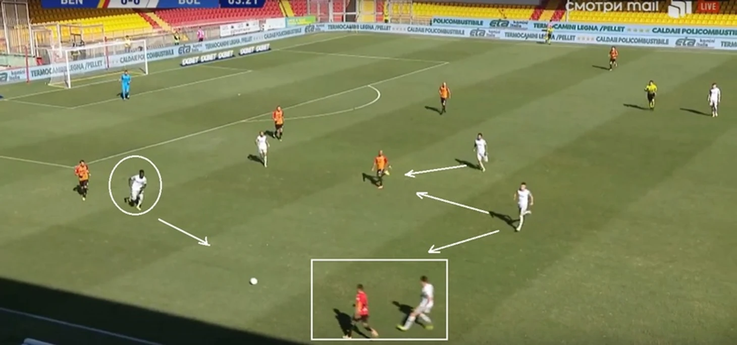 Хорошо видна и схема « Беневенто». При такой игре Схауден стал одним из самых активных игроков гостей, совершивший 4 обводки. Хоть « Болонья» и имела преимущество в начальной фазе из -за схемы хозяев, но это никак не отразилось в атакующих действиях напрямую — « Беневенто» хорошо перемещался и выстраивал блоки на флангах. Но так было не всегда — « Болонья» часто комбинировала на начальной трети чужой половины: