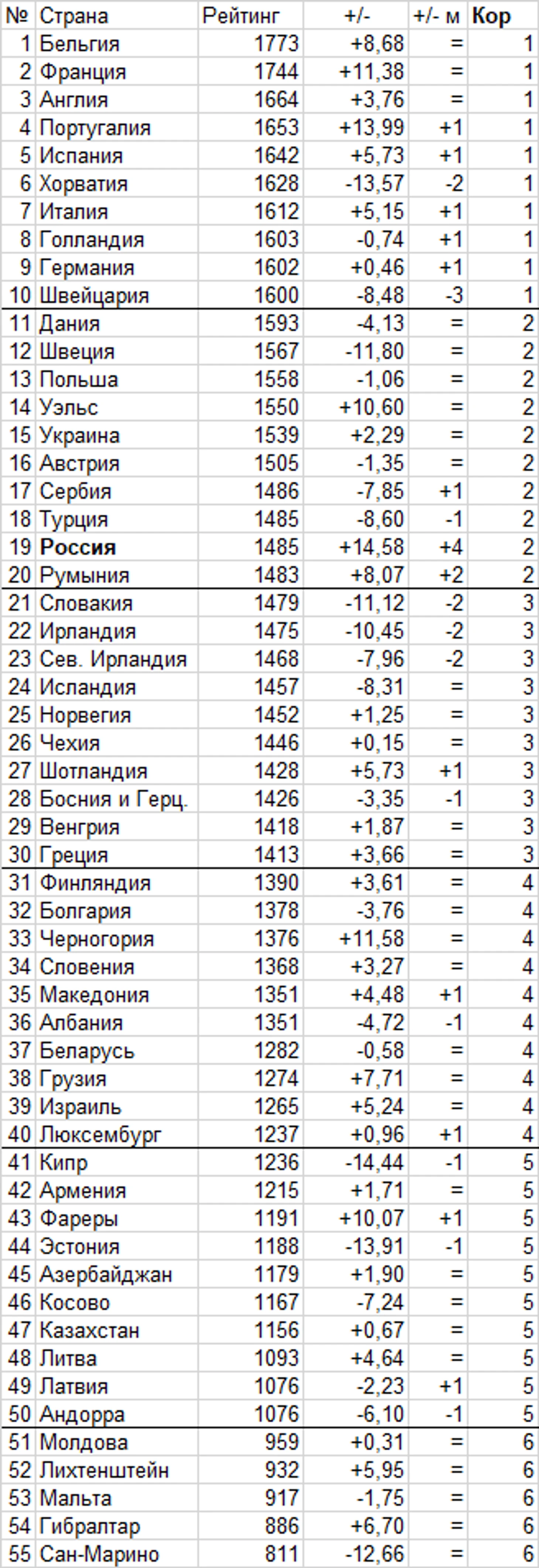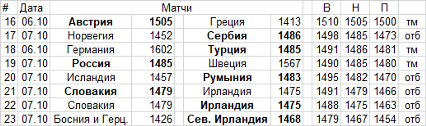 # - пор. номер в рейтинге; В,Н,П - итоговый рейтинг выделенной команды в зависимости от ее результата; тм - тов контрольные матчи, отб - стыки за выход на ЧЕ-20.