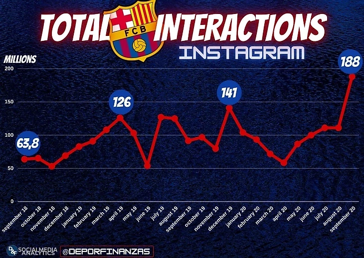 Агентство Deportes&Finanzas продолжает подсчёт показателей спортивных клубов со всего мира в социальных сетях. Итоги сентября примечательны: ФК "Барселона" установила мировой рекорд, достигнув отметки в 188 млн взаимодействий в Instagram за месяц. Это самый высокий результат из когда-либо наблюдавшихся в социальных сетях в спортивном сегменте.