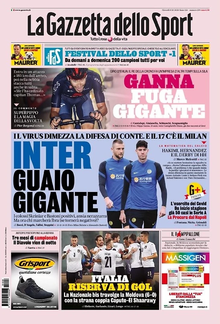 Проблемы с защитниками в «Интере» из-за Ковида, расторжение контракта Сарри с «Юве», а также разгром Молдавии Италией в товарищеском матче – в утреннем обзоре заголовков итальянских спортивных изданий в блоге «В гостях у Кальчо».