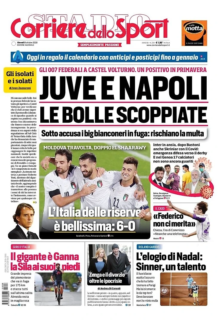 Федеральные агенты в Кастель Вольтурно. Один ковид-положительный в Примавере. Обвиняются топ-бьянконери в отъезде: риск штрафа. «Интер» в тревоге, после Бастони также Шкриньяр с Ковидом: чрезвычайная ситуация в обороне перед дерби. И в «Дженоа» 17 игроков ещё не выздоровели.