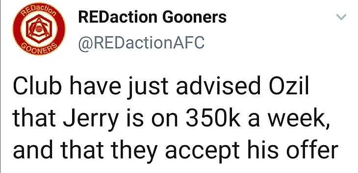 «Клуб только что сообщил Озилу, что Джерри (Гуннерзавр Рекс) получает 350 тысяч фунтов в неделю (зарплата Озила в «Арсенале»), и они принимают его предложение».
