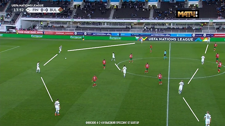 Сразу же обозначим про прессинг. Новая заметка. Сборная Финляндии начинает прессинговать обычно только на своей половине поля – форварды лишь обозначают в районе центрального круга, а вот полузащита включается только уже у себя. Сегодня же несколько раз финны включались вшестером на чужой половине в той ситуации, когда болгары не могли пройти первую треть поля. Чаще отбор удавался, происходило это за счет неточного паса болгар вперед. Но иногда гости и выбирались из-под него, что создавало иллюзию опасности. В прошлых играх такое не замечалось – возможно, что из-за схемы.