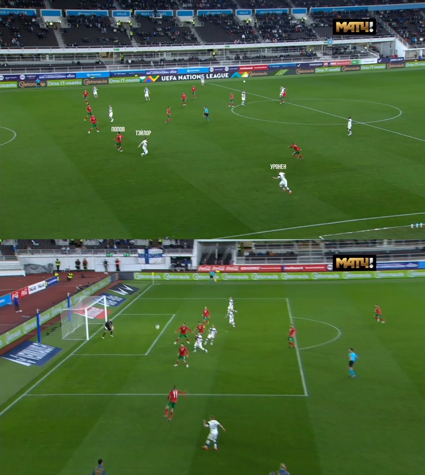 Уронен не так часто подключался к атакам в первом тайме – просто потому, что левый фланг в сборной практически не используется. А тут, видимо, сработала в перерыве установка Канервы – и тот начал колесить по флангу, ручки поднимать что, мол, свободен, подавайте… Здесь также помогла тактика атакующих игроков, в особенности Тэйлора, за которым ушел Страхил Попов. Весь край был предоставлен Ере, который без проблем прошел до нужной точки и подал.