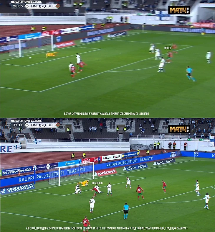 Перейдем совсем ко второму тайму. И здесь вновь надо отметить, что начался он сверхактивно с атак болгар, очень сильно страдал левый фланг Уронена. Четыре момента за четыре минуты! Правда, один из них случился с офсайдом, но болгары вновь не добились того, что заслужили точно.
