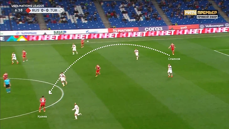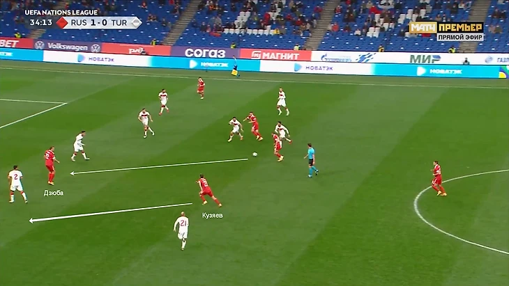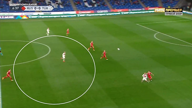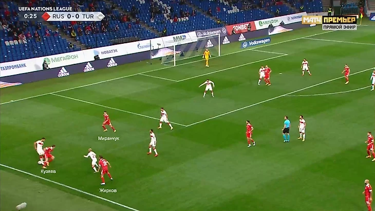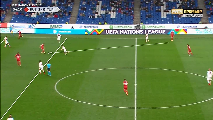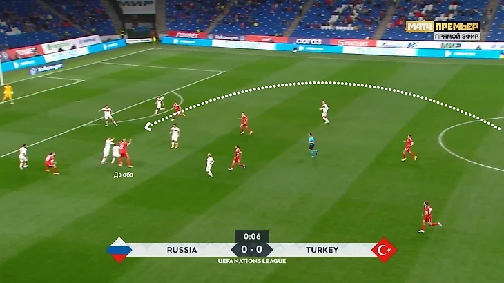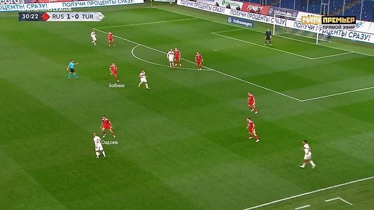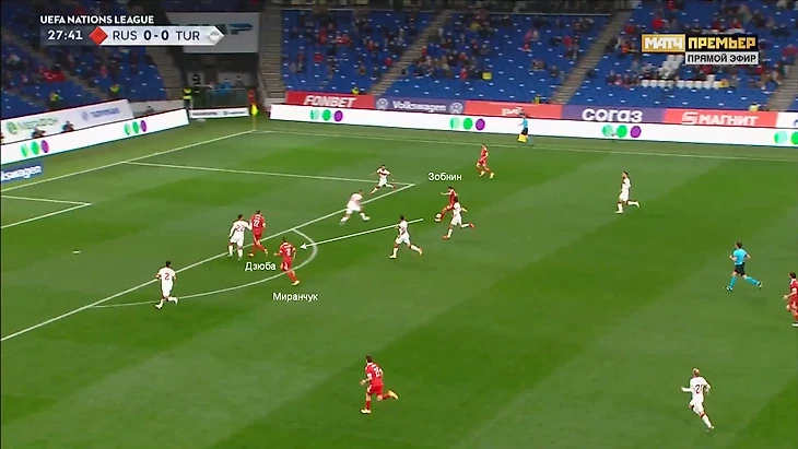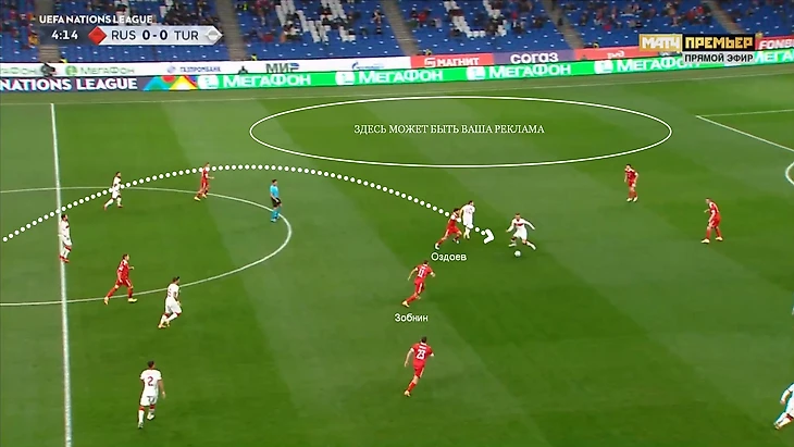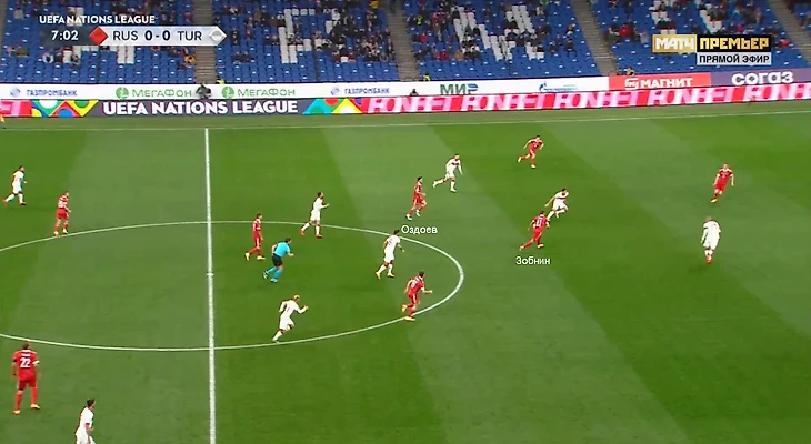 Зобнин и Оздоев в начале матча очень сильно проваливались, они пытались играть выше, чтобы прессинг их команды был интенсивнее и эффективнее, но сб. Турции этим хорошо пользовалась, они просто закидывали мяч им за спины. Кроме провалов в опорной зоне вы можете заметить абсолютно пустой правый фланг сб. России.