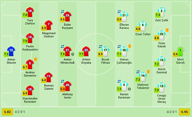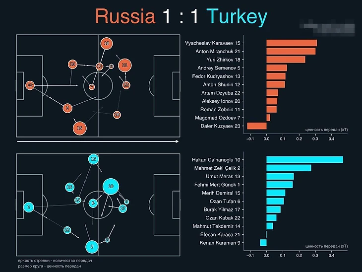 У Турецкой сборной самым активным был Чалханоглу, он был связывающим звеном атаки и полузащиты. Хакан находил варианты передачи на флангах, и в штрафной соперника, по статистике сб. Турции сделала 23 передачи в штрафную соперника, в то время, как сб. России сделала 16 таких передач.