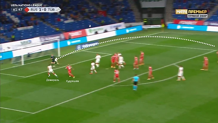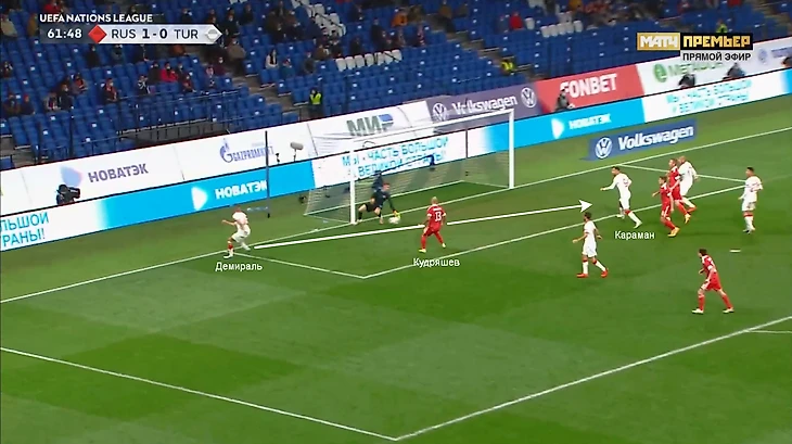 Хакан Чалханоглу делает длиннейшую передачу на дальнюю штангу, на которой оказывается Демираль, Мерих легко оторвался от Кудряшева и сделал передачу в центр.