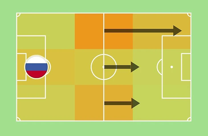 Главной задачей во время начинания атак было - найти партнера между линиями соперника, а если быть точнее, то между линией защиты и полузащиты. У сб. России это получалось, именно так родилась одна из самых опасных атак хозяев поля.