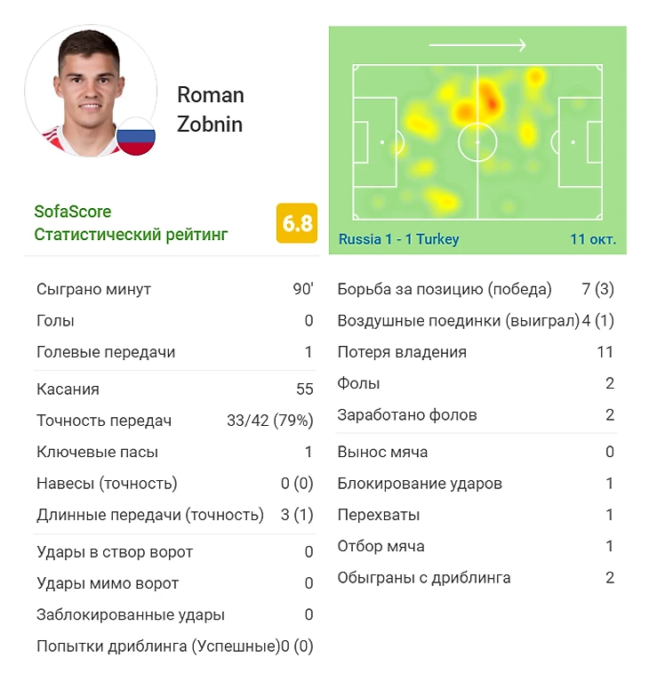 Тепловая карта Зобнина указывает именно на то, о чем я говорил в начале - Рома помогал левому флангу, а точнее Жиркову. Вообще, мне кажется, что Черчесов специально выставил на левый фланг Кузяева, ведь Далер хорош в отработке сзади, но это не понадобилось, так как в обороне помогал Зобнин, да и Жирков в целом был очень хорош, у него 1 отбор, 2 перехвата, выиграл 3 из 3-х воздушных дуэлей, но у него был один огромный минут, Юрий потерял мяч 21 раз ! Вообще в этом матче было очень много потерь, как у сб. России, так и у Турции. Раньше, когда я смотрел матч Манчестер Сити - Тоттенхэм, я удивлялся тому, что Стерлинг потерял мяч 7 раз, это было очень много, но в этом матче у игроков по 17, 18, 19, 20 потерь, а у Жиркова 21, вот теперь чувствуется разница, она огромная.