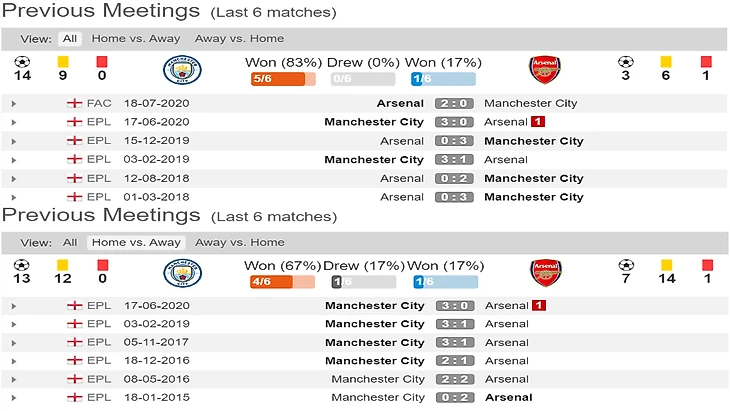 Последние шесть встреч соперников. В кубке победа Канониров, в АПЛ пять побед Сити. Шесть последних матчей на Этихаде: четыре победы Сити, одна ничья и одна победа Арсенала.